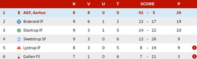 Nummer to i rækken er Brabrand IF, der har 19 point efter ni kampe.