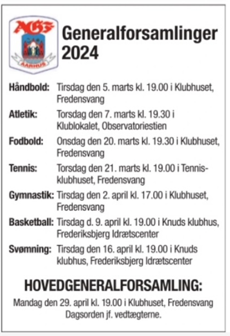 Af nedenstående annonce, der var indrykket i Århus Stiftstidende samt JP Århus den 19. februar 2024, fremgår det, at fodboldafdelingen holder sin generalforsamling onsdag den 20. marts kl. 19.30.