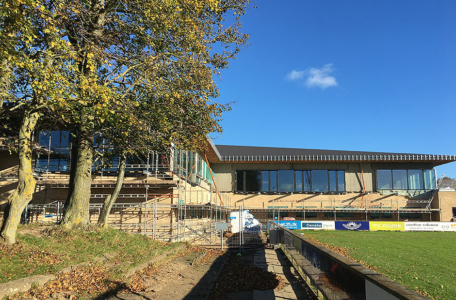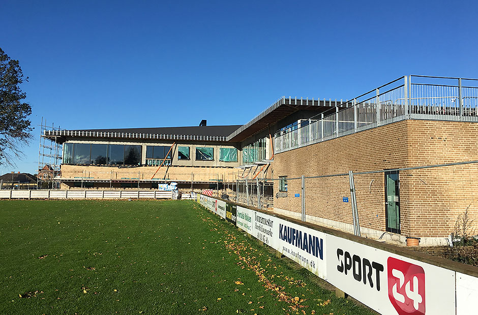 Arbejdet med det nye klubhusbyggeri på Fredensvang skrider planmæssigt fremad. Taget er lagt, vinduerne er sat i, og der mangler ikke meget, før den udvendige del er helt færdig.